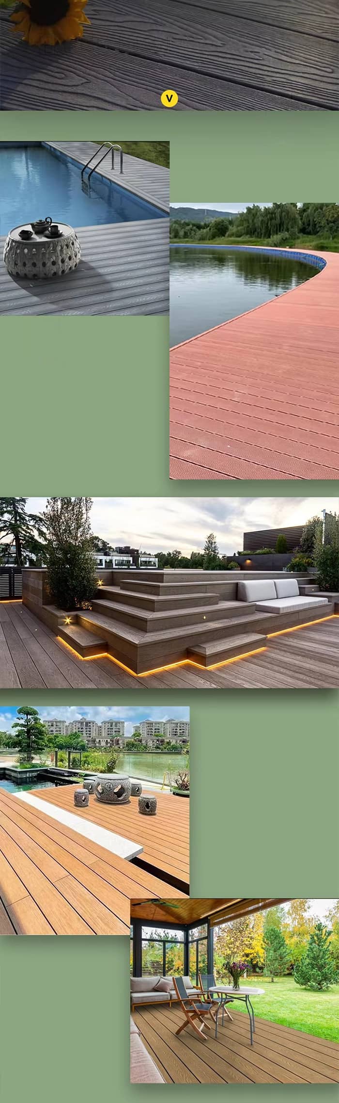Utemiljø: Som terrasser, dekk, hagestier, kommersielle gågater, etc., med sterk værbestandighet, anti-insekt, egnet for utendørs bruk