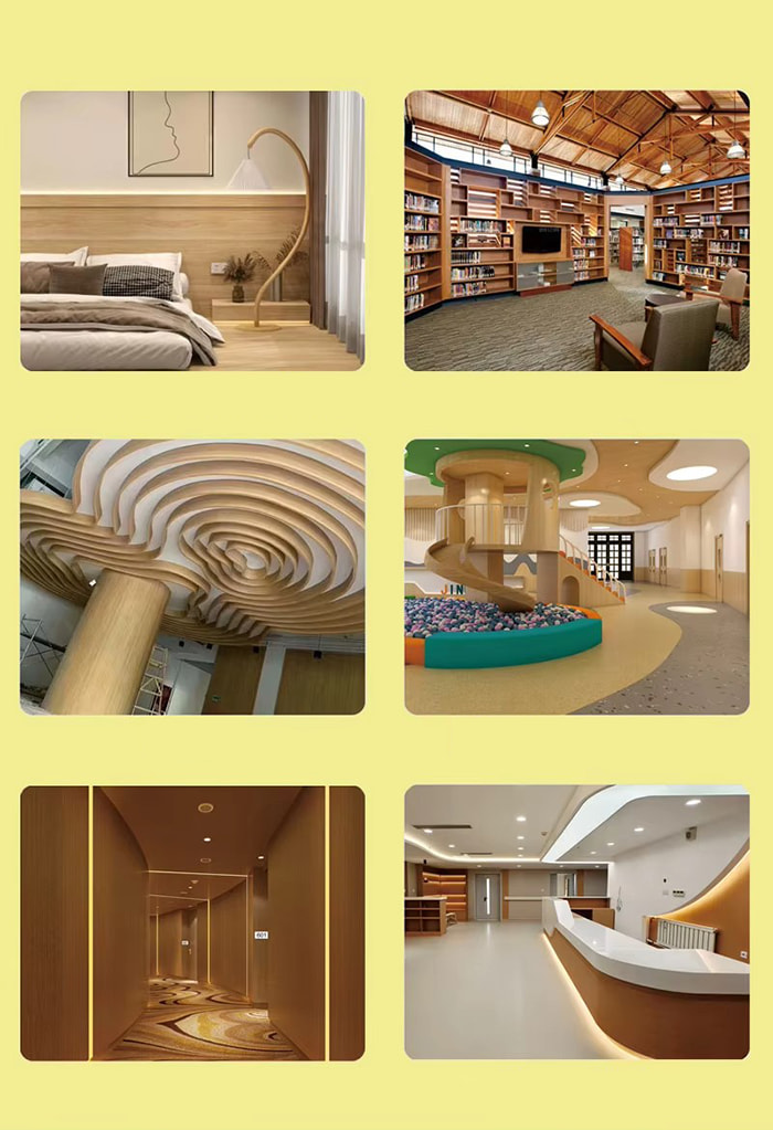 Byggematerialer: brukes til dører, møbler, garderober, skap, innvendig veggdekorasjon, takdekorasjon, etc.