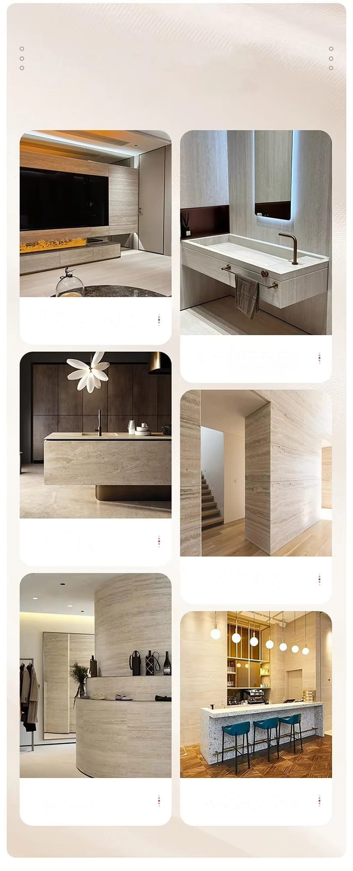Bygge innvendige vegger: Kan brukes til innvendig veggdekorasjon av boliger, kontorer, hoteller, kjøpesentre, skoler, sykehus, kontorbygg, villaer, high-end samfunn, etc., som bakgrunnsvegger, kjøkken, bad og andre rom.
